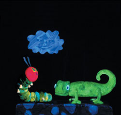 Le metteur en scène Jim Morrow a transposé à la scène l'univers visuel d'Eric Carle avec beaucoup de soucis et de fidélité. En se servant des «blacklights», de marionnettes géantes, d'un décor et d'accessoires (conçus par Morrow) recouverts de peintures fluorescentes, il crée un spectacle flamboyant, aux couleurs vibrantes. Les marionnettes, faites de mousse, manipulées pour la plupart par deux tiges de bois, sont magnifiques - on tombe complètement sous le charme du caméléon à la démarche si rigolote et réussie ou de la jolie chenille aux grands yeux. Les marionnettistes John Allen MacLean et Mary Rebecca Russell sont complètement invisibles dans ce décor qui ne prend que le centre de la scène, que l'on croirait sorti littéralement des livres de Carle. La musique de Steven Naylor accompagne admirablement bien les aventures de chacun des personnages, même s'ils ne font parfois que peu de choses. La narration française a été confiée à l'acteur Jean-François Casabonne, qui, de sa voix posée et tranquille, accomplit un travail impeccable.