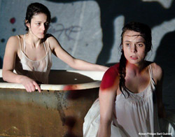 Avec très peu de moyens scéniques et d'informations sur ces personnages, Gabriel Plante nous fait rapidement croire en cet univers. Le décor entièrement blanc qui englobe pratiquement toute la salle (une toile qui couvre également le plancher et le plafond) vient aseptiser toute tentative de représentation de lieu. Rapidement, le public accepte d'être nulle part, en compagnie de deux jeunes femmes dont on ne sait rien sauf qu'elles sont ensemble. Cette connexion entre les deux femmes est d'ailleurs très bien défendue par les jeunes finissantes de Saint-Hyacinthe Alexa-Jeanne Dubé et Marie-Philip Lamarche, bien que le jeu soit parfois moins soutenu lors de scènes physiquement difficiles pour elles.