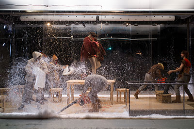 On sursaute de prime abord devant ces enjambées temporelles quelque peu aléatoires qui surgissent tout au long des trois pièces, mais qui, au final, confirment la liberté et la folie des artistes du NTE. On demeure parfois dubitatif devant certains choix qui sont davantage anecdotiques alors qu'on applaudit certaines parties au cynisme implacable ou à la force redoutable. La mise en scène remarquable des deux premières pièces permet de se laisser immerger complètement dans chaque élément. Dans la première, de la neige tombe régulièrement et nous assistons même à une impressionnante tempête de neige. Dans la deuxième, de la pluie tombe du dispositif scénique et on nous présente un tout aussi impressionnant naufrage. Dans le troisième volet, qui devrait être le point culminant... que du faux gazon et pas de jeu particulier avec un élément scénographique, ce qui nous laisse sur notre faim. Les trois pièces ayant été pensées dès le départ, il est dommage que cet aspect esthétique se soit évanoui pour la finale.
