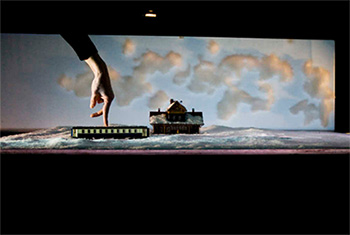 L’appellation Kiss and Cry est une expression empruntée au patinage artistique, désignant l’espace où, le plus souvent assises sur un banc, les patineuses attendent avec impatience l’appréciation des juges sous le regard des caméras et des spectateurs. Sur scène, nous observons plusieurs maquettes, lieux de tournage qui serviront à créer sous nos yeux un film, parfois à la limite de l’abstraction, projeté en arrière-scène. Plusieurs caméras nous dévoilent progressivement ces lieux imaginaires, abstraits ou représentatifs, habités de figurines minuscules et de souvenirs. Les deux protagonistes sont une main de femme et une main d’homme évoluant avec la grâce de danseurs suivant la musique.