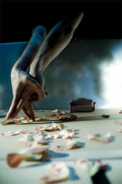 Assise dans une gare, une femme se remémore ses amours passées. Pour ténu que soit le fil de l’anecdote, l’ensemble, par son esthétique, accède à une dimension lyrique singulière. Narrée par une voix off, l’histoire est interprétée par des mains, qui dansent et incarnent les personnages. Évoluant dans des décors faits de sable, d’eau, d’objets divers, la chorégraphie, filmée en gros plan, est projetée simultanément sur un écran, où se brouillent échelles et perspectives, où se fondent le petit et le grand pour créer un monde à la beauté mystérieuse, onirique. Happé par les images du film et par le ballet des artistes passant d’une station à l’autre, sur la scène devenue plateau de tournage, le regard contemple à la fois l’œuvre et la création, en direct, de celle-ci.