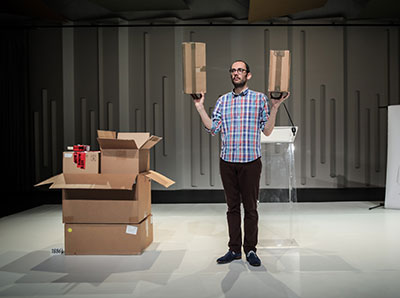 Il ne faut jamais rater l’occasion d’assister à un spectacle de l’Amicale de production et du génial Antoine Defoort. Plusieurs festivaliers, de Montréal comme de Québec, se remémoreront avec plaisir les superbes Eternal, &&&&& & &&& et Germinal. C’est avec une conférence maintenant aboutie que Defoort se présente devant public, au Périscope, pour parler du fascinant, mais dédaléen sujet du droit d’auteur.