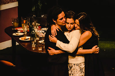 Du texte original, Jatahy ne conservera essentiellement que les personnages principaux. Ouste Natacha, le Baron, Tcheboutykine, Fedotik… Même le mari de Maria (Macha, dans la version russe) n’apparaitra que furtivement, et l’amant d’Irina, Saliony, se manifestera plutôt comme un flirt par SMS, un homme qui semble par ailleurs avoir une mauvaise influence sur la jeune femme qui se scarifie pour lui. Christiane Jatahy extirpe le trio de la Datcha Blanche de Yalta du début du 20e siècle pour les catapulter dans le Brésil d’aujourd’hui – on y entendra The Cure, George Michael ; on parlera des politiques du président illégitime Temer, des Pussy Riots. En ce jour ensoleillé, on célèbre le 20e anniversaire d’Irina, bien qu’il soit teinté par le décès du paternel, survenu un an plus tôt. La fête pousse les trois femmes à réfléchir sur le temps qui passe, leurs désirs d’ailleurs, leurs désirs tout court. Olga, ne se sentant plus très jeune, joue à la mère et se remémore des moments où les yeux des hommes la dévoraient ; Irina rêve, de son côté, de partir vers Moscou, découvrir le socialisme, Lénine, Dostoïevski… autant aller visiter un cimetière, s’exclame Olga. Maria, dont le cœur est un « piano fermé à clé », n’a obtenu du mariage que des bribes du bonheur promis. Amère, elle tentera de trouver des réponses dans les bras d’un amant d’un soir, un ami d’enfance de passage pour la fête d’Irina. Trois femmes orphelines laissées à elles-mêmes, prises dans les pièges invisibles de la solitude et des désirs inassouvis, paralysées entre émancipation et renoncement.