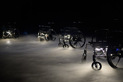 Dans une certaine poésie toute mécanique et visuelle, Nous voilà rendus parle aussi de l’absence, grâce à quatre fauteuils roulants motorisés et éclairés qui sillonnent la scène, dansant parfois sur des airs de violons. Ils roulent doucement, s’arrêtant ici ou là, transportant des fantômes, les esprits de celles et ceux qui ont participé au projet sans pouvoir être présents sur scène, ou alors évoquant les personnes qui disparaissent, chaque jour, dans l’oubli. Quelques transitions s’avèrent un peu longues, sans pour autant altérer la pertinence de leur propos.