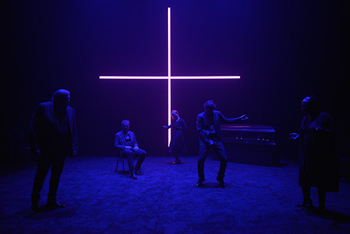 Allant de pair avec les costumes assez sobres conçus par Cynthia St-Gelais, l’espace scénique est très épuré. Seuls l’imposante croix en néons et le cercueil étincelant attirent les regards. L’omniprésence du deuil et de la mort dans la vie, mise ainsi en évidence, renvoie efficacement à cette sombre vérité. Par chance, certains morceaux plus festifs de la trame sonore de Larsen Lupin s’agencent avec l’éclairage dynamique d’Erwann Bernard pour alléger le drame, aidant grandement les comédiens à amplifier l’intensité de leur performance qui apparaît déjà comme l’ultime de leur vie. Plusieurs moments loufoques feront certainement bien jaser à la sortie du théâtre.