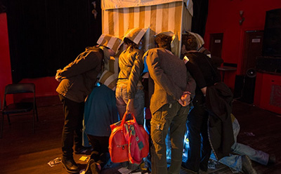 À la mezzanine du Théâtre Outremont, sur le chemin vers les toilettes après la représentation de Bastard, se trouve un petit chapiteau. Minuscule billet en main indiquant l'heure de notre tour, on grimpe les escaliers et on attend patiemment (ou non). Dès que l'on peut s'approcher de la tente bleu et blanc, trouée d'une quinzaine de lucarnes, cette envie irrépressible de voyeurisme nous assaille. Que retrouverons-nous à l'intérieur?