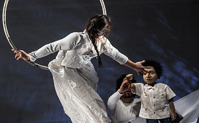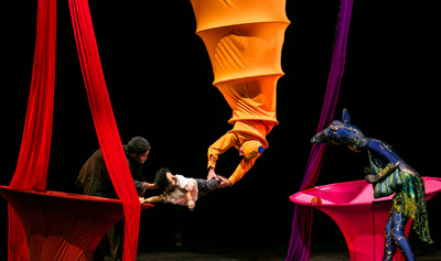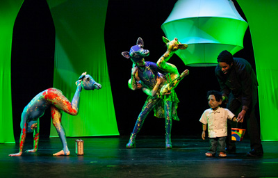 L’auteure et metteure en scène Hélène Ducharme avait le désir d’explorer le thème de l’immigration, ou plus précisément les sentiments ressentis par le nouvel arrivant et ce qu’il laisse derrière lui. Le choc des cultures, le réapprentissage d’une nouvelle langue et des codes de société sont au cœur de cette création surprenante. Pour y arriver, la femme de théâtre jumelle ici trois disciplines artistiques plutôt distincts : la marionnette, le théâtre d’ombres et les arts circassiens. Pourtant, le mariage fonctionne à merveille : alors que Luna, sa grand-mère et son père sont représentés par de belles marionnettes à la forme de poupées rondes et réalistes, les habitants du pays d’accueil prennent plutôt la forme d’étranges animaux acrobates. C’est que Pablo ne voit pas l’étranger comme un être humain, mais perçoit son « nahualli », son double animal, selon une croyance aztèque. Des créatures qu’il peine d'ailleurs à reconnaître, tant elles sont différentes de tout ce qu’il a déjà vu. Hyper colorés, les costumes de girafes et autres animaux sont superbes ; les acrobaties au cerceau, à la corde, au ruban et au trapèze, ainsi que la langue inventée utilisée par les personnages accentue cette impression d’étrangeté éprouvée par le Mexicain : on est carrément sur une autre planète. Certains numéros évoquent de façon abstraite des concepts plus concrets – la ville, par des lumières qui tournoient rapidement ; d’autres sont rigolos – alors que Pablo doit vendre de l’artisanat pour se faire un peu d’argent, il se fait arrêter par un policier qui descend d’une spirale rappelant une ruche –-, ou encore émanent d’une poésie visuelle splendide – Pablo et Luna jouant dans la neige, évoquée par un drap blanc qui vient s’enrouler autour des jambes d’une trapéziste qui vrille sur elle-même.