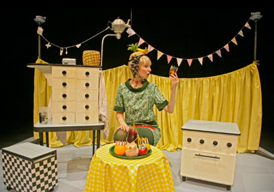 La scénographie, qui paraît d'abord simpliste - une armoire avec une dizaine de tiroirs et deux ou trois petits meubles bas -, recèle de nombreuses surprises. Ici, une théière se transforme en lampe. Là, un toune-disque apparaît, où iront discuter les invités. Le batteur à manivelle s'improvise téléphone, et la boîte à farine cache une minuscule toilette portative. Et le bain? Dans une autre boîte, carrelée comme une salle de bain typique, et moussant, grâce au batteur et à du savon à vaisselle ; tout est prêt pour chasser la boue de cette Patate qui y traîne un peu trop souvent.