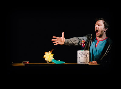 Pour cette nouvelle création, le Théâtre de la Pire Espèce reste fidèle (pour notre plus grand bonheur) à ses premières amours en optant pour un tout petit castelet et du théâtre « sur table ». Cette fois, la table est un paysage, un peu plat, nous avoue d’entrée de jeu le narrateur incarné par Francis Monty. C’est pourtant le paysage où il plante le décor de cette histoire : celle d’Ethienne, le dernier d’une fratrie de 57 garçons. Petit bonhomme en papier carbone reprend l’univers que Monty avait déjà exploré avec Léon le nul; on y retrouve la même famille, sauf qu’on s’intéresse cette fois à l’un des frères de Léon, ledit Éthienne avec un H. Éthienne se sent différent d’eux tous et surtout de son père, un homme mou qu’il compare à une vache; si différent en fait qu’il doute de ses véritables origines et s’en invente de nouvelles. Porté par une sensibilité étonnante, il part en quête.