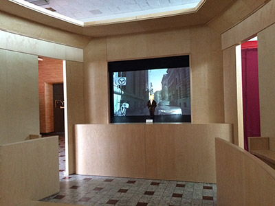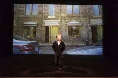 Expérience captivante, L’homme qui marche est une création du 1700 La Poste, « lieu privé consacré aux arts visuels et à ses enjeux discursifs », avec la participation de UBU compagnie de création – on reconnaîtra immédiatement le dispositif scénique, ici parfaitement maîtrisé, que l’on a pu observer lors d’autres créations, dont Les aveugles. Le spectateur est invité à entrer dans une petite salle toute faite de bois, à l’essence préservée, conçu par l’architecte Luc Laporte, à qui, avec cette création, on rend hommage. Le créateur était fasciné par la marionnette, et il « ne cessait d’imaginer de grands théâtres, intégrés à la ville ». Sur l’écran derrière la petite scène, des images en noir et blanc et en couleur du boulevard St-Laurent, de la rue St-Denis et de la Petite Italie défilent. Devant celles-ci, une marionnette mécanique marche, inlassablement. Sur son visage sont projetés les traits du comédien Carl Béchard. Alors qu’il flâne, le comédien récite quelques extraits de textes de Raymond Queneau (Exercices de style), Lewis Carroll, Blaise Cendrars, de la Fontaine, Prévert, De Saint-Denys Garneau, aisément reconnaissables, devenant parfois un étonnant exercice de prononciation. On ne peut détacher le regard de ce pantin hyperréaliste, légèrement envoûté par cette longue marche... immobile.