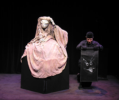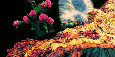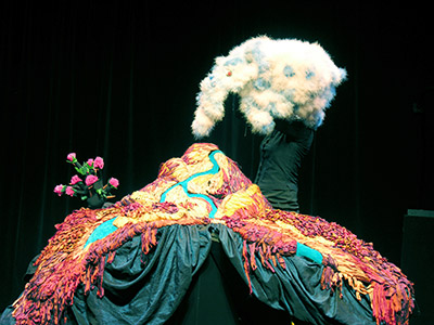 La grande marionnette de la Terre mère (belle et gracieuse création de Richard Lacroix) abrite sa création dans les replis de sa robe et la protège de ses bras vastes. Sous son regard bienveillant et maternel, plusieurs petits personnages attachants se disputent l’espace, l’amitié et l’attention de leur créatrice. De la fourmi timide au dragon cracheur de feu, ils découvrent leur monde et apprennent à y cohabiter. Manipulées en partie à vue, ces créatures charment par leur allure sympathique et colorée, et par l’humour de leurs échanges. Elles prennent forme en un tournemain sous les doigts habiles des marionnettistes, tantôt plus vives tantôt plus maladroites. Marionnettes à tiges, à gaines, à doigts (en particulier l’écureuil) sont tout à fait adorables à voir habiter l’espace, de moins en moins vide.