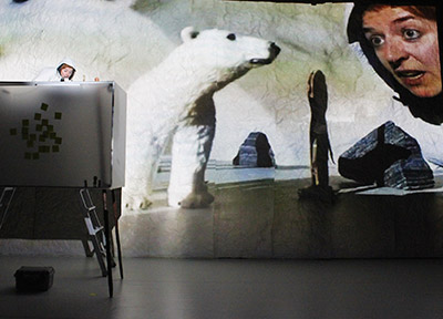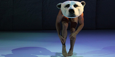 Dans un espace d’abord dépouillé, nous voyons, côté jardin, à l’intérieur d’un cube, une silhouette féminine qui agite un poisson. Près d’elle, un homme arrive et lance quelques sons. Côté cour sur le sol trône une tête d’ours polaire. Mais tout au long du périple, c’est José Babin qui occupe le devant de la scène avec un ton sympathique et convivial. Lorsqu’elle enfile, tout comme ses deux partenaires de jeu, un costume d’ours polaire, son bonheur devient contagieux.