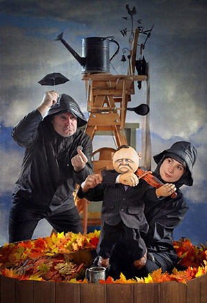 La scénographie, aussi conçue par Judd Palmer – on nage réellement dans son univers – semble sortir d’un livre pour enfants. Le jaune et le rouge des feuilles d’automne qui jonchent la scène sont particulièrement chauds ; la pluie qui tombe sur l’homme et son parapluie, venant d’un arrosoir de jardin, crée un effet BD savoureux. Manipulant à vue, les deux comédiens font partie de l’histoire, portant vestes et chapeaux imperméables noirs, comme les parapluies.