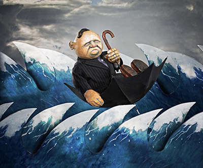 Adapté d’un joli petit bouquin écrit par Judd Palmer, nommé pour le Prix littéraire du Gouverneur général littérature jeunesse en 2012, la très sympathique pièce Le parapluie aborde des thèmes plutôt sérieux, mais sans être pour autant tragiques : la consommation, l’amour pour l’objet et l’intérêt des objets après leur vie utile. La mise en scène de la directrice artistique du Quest Theatre de Calgary, Nikki Loach, est colorée ; les accessoires un peu patentés – une chaise haute avec un mécanisme pour le tonnerre, des vagues actionnées avec un levier – rappellent légèrement Méliès. Pour illustrer l’homme, manipulé ici toujours d’une main de maître par Anne Lalancette : une marionnette qui semble sortie tout droit du spectacle Innocence du Old Trout Puppet Theatre, partenaire du projet (avec le Puente Theatre de Victoria). À l’origine joué par Judd Palmer, le narrateur est ici interprété par l’exubérant Troy O’Donnell, comédien anglophone qui réussit quand même à très bien livrer ses tirades en français, malgré le ton plus poétique et plus complexe de certaines phrases.