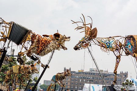 Les bêtes dansent ou Le sortilège discret de la nature sauvageLes Bêtes dansent ou le Sortilège discret de la nature sauvage est un spectacle de rue qui entraine le public dans une ronde d’animaux à grande échelle. Cette célébration de la beauté du monde et des mystères de la vie sur terre investit la place publique et inspire l’émerveillement. Le symbole du loup, bête qui incarne toutes nos peurs, est au coeur de ce conte vivant qui traverse les territoires et les cultures. La manipulation fine des animaux géants est assurée par une équipe d’artistes du Mexique et du Québec, accompagnés d’enfants. Grands et petits sont interpellés alors que se déroule autour d’eux l’histoire d’une meute de loups et d’un cerf magnifique. Une danse ancestrale qui met en scène chasseur et proie.