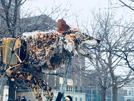 Manipulées par des artistes du Québec et du Mexique, et accompagnées d’enfants et de leurs marionnettes fabriquées lors d’un atelier avec des matériaux recyclés, les très belles créatures des Bêtes dansent ou le sortilège discret de la nature sauvage ont parcouru les environs. Elles ont grignoté des glaçons suspendus aux toitures, se sont perchées sur les parcomètres et les arbres, ont bondi au-dessus du bassin, se sont laissées apprivoiser, flatter, avant que le signal de la chasse soit donné dans un moment inspirant où la meute a enfin croisé la route du cervidé.