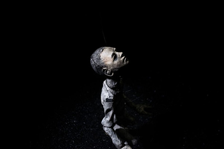 La marionnette explore son environnement, jette des coups d’œil à son manipulateur, pousse des râlements, cherche à s’aventurer au-delà des frontières du castelet, ciblant le centre du plafond comme une échappatoire potentielle. Le milieu dans lequel elle évolue semble hostile : la lumière est rare, le sol tremble, l’air est froid. Les gestes du personnage sont précis et mesurés grâce à ses nombreuses articulations qui lui permettent une grande variété de mouvements. On en vient à oublier la présence du manipulateur au-dessus de nos têtes, qui semble multiplier les positions contraignantes et inconfortables pour suivre le désir d’exploration de sa marionnette.