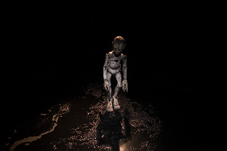 Un cylindre de métal de 3,7 mètres de haut trône au milieu du studio de la Maison international des arts de la marionnette (MIAM). En plein cœur de cette structure, agenouillé sur le sol recouvert de gravier humide, un personnage repose, inerte. Le public s’installe tout autour. Lentement, le personnage prend vie, se redresse, regarde autour de lui. Juché en haut du castelet, Renaud Herbin manipule les dix-huit fils qui donnent vie à l’étrange pantin confectionné par Paulo Duarte. Même si la marionnette adopte une forme anthropomorphique, ses membres ne respectent pas les proportions naturelles de l’humain. Ses mains et ses pieds semblent avoir grossi à force d’avoir été en contact avec la matière environnante.