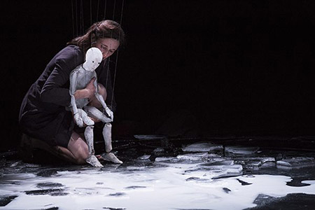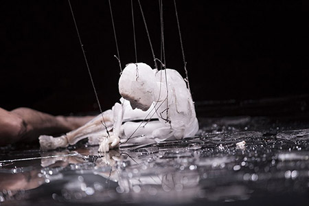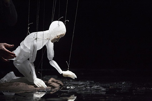 Manipulée à distance par de grands câbles, la marionnette de glace se déplace à pas prudents. La technique ne permet pas une manipulation aussi fine qu'avec des fils plus courts et malléables, mais la dextérité avec laquelle Hélène Barreau insuffle la vie à ce corps épuisé, faible et vaincu par sa destinée, est admirable. Oedipe, malgré ses efforts pour échapper aux prophéties, n'est qu'un jouet entre les mains des dieux.