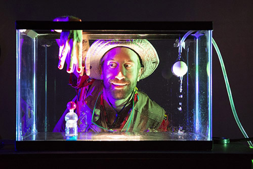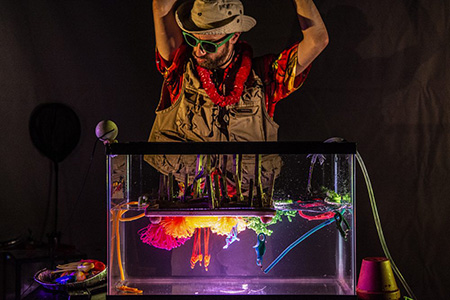 Avant le début de la représentation avoisinant les 45 minutes, l’artiste nous incite à avoir une attitude décontractée devant un exposé à des années-lumière de la pédagogique ronflante. Vêtu d’un costume d’excursion et portant des lunettes vertes fluorescentes, il manipule d’innombrables objets dans un aquarium de 190 litres, qui se remplit au fur et à mesure, avec ses doigts recouverts d’un vernis à ongles rose.