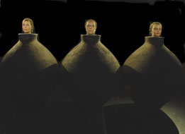 Déplacement du public vers Beckett et sa Comédie. Le corps emprisonné dans une jarre, trois personnages d’un triangle amoureux expient, par une logorrhée verbale d’une rapidité étourdissante (étouffante à en donner le hoquet !), leur surmoi dans une anecdote d’adultère où chacun se trouve dépossédé de soi dans l’absence de l’objet de leur désir égoïste et blessé. Toujours par procédés de visages projetés sur têtes de mannequins, l’effet donné colle à l’esthétique minimaliste de Beckett, rappelant ses fameux personnages dissolus de leur corps tels que Winnie de Ô les beaux jours, tels que les habitants stoïques des poubelles de Fin de Partie.