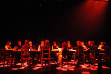 Un banquet de poèmes servis sur une immense table. Au-dessus, autour, sous cette table, des comédiens, chanteurs, danseurs et musiciens se lancent des mots comme on trinque à l’amitié. Ce ne sont pas les auteurs qui lisent ici leurs textes, mais des comédiens qui mettent toute la force de leur jeu à faire vivre les mots. Au menu : une pincée de Gauvreau, un zeste de Rimbaud, une bouchée de Guy Mauffette, une larme de Jim Morrison… Un amalgame d’univers se baladant entre l’enfance et la mort, l’érotisme et le romantisme, le trash et le lyrisme. Avec la complicité du comédien Francis Ducharme, Loui Mauffette, maître d’œuvre de Poésie, sandwichs et autres soirs qui penchent, joue de simplicité pour théâtraliser la poésie, la décomplexer un peu, la décoiffer beaucoup. (S.L et M.C.)