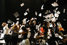 Élitiste la poésie? Pas ici. Ici, on joue avec les mots, on jette à terre les feuilles qui en sont couvertes, on court, on se chamaille, on se vautre, bref, on joue et on se joue. Et le spectateur a tôt fait de se faire happer par l’ambiance tantôt joyeuse tantôt grave mais toujours amicale qui règne du début à la fin du festin.