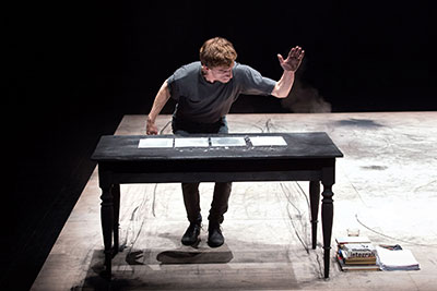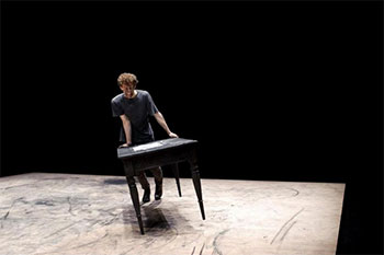 Sad Sam Lucky se partage en trois actes. D’abord, Ferlin, debout sur une scène salie au charbon, toisant le public, finit par prendre quelques feuilles et les agrafe à une table noire. Il tourne le dos au public et commence par un vers de Kosovel : «A lot of work awaits me, isn’t that cheerful? ». Une phrase qui reviendra à quelques reprises, devenant de plus en plus ironique, voire cynique. Puis, l’interprète aborde les mots de Kosovel, tentant de les faire siens, opposant ceux-ci à sa réalité. La table subit certains coups, des mains et d’une épaule, alors que le monologue devient légèrement surréaliste. Ferlin tombe ensuite dans son quotidien, enchaînant pensées, anecdotes, bruits divers. La troisième partie vient casser délibérément tout ce qui fut montré jusqu’ici, par une chorégraphie forte, brutale, parfois naïve, parfois animale. La table, après qu’on ait expérimenté sa sonorité, devient un véritable partenaire de danse, et ce, bien malgré elle. Elle prendra plusieurs formes, d’un lit de fortune dans un squat à une barricade, d’un débris tombé à un boulet. Il y a quelque chose de la guerre des Balkans dans ces gestes violents, ces balles qu’on évite. La musique de Luka Prinčič – la seule qu’on entendra de tout le spectacle – résonne à tue-tête ; c’est le désespoir et la folie qui émergent dans ces gestes et ses pauses, une apocalypse toute personnelle.