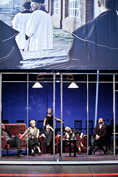 Tandis que les invités attendent l’arrivée promise d’un acteur du Théâtre National, les minutes s’allongent, le temps piétine, les sujets se cherchent, les paroles tournent à vide. La mise en scène de Lupa, un habitué des textes de Thomas Bernhard, insiste volontiers sur la nature irritante de cette attente, celle de l’arrivée du comédien, celle de la révélation artistique, celle du débat intelligent, de la révolte, de l’accomplissement, du dévoilement… Mais rien ne se produit jamais. Pendant la première heure et demie, sur scène, c’est l’immobilisme qui règne en maître, et le public a l’impression de s’enfoncer à son tour dans cet état de stagnation. Figés d’ennuis dans leurs sièges, le regard fixé partout sauf sur leurs voisins, les artistes en déclin déversent leur venin d’abord indirectement, puis de plus en plus ouvertement, à mesure que la soirée avance et que l’alcool délie les langues. Leur fiel coule sur scène comme un sirop épais, qui englue jusqu’à leur moindre mouvement.