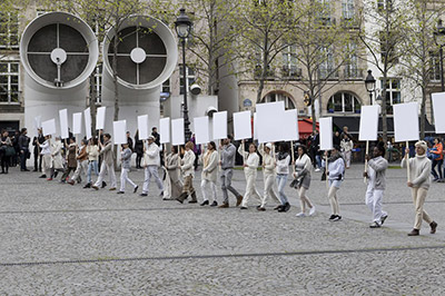 Blank Placard Dance, replayUne fanfare, des airs de résistance. Un cortège formé d’une trentaine d’individus sillonne le centre-ville, portant des pancartes sans slogans. Des pancartes muettes comme ces drôles de manifestants qui ne scandent rien. Aux passants intrigués qui demandent contre quoi ils protestent, les marcheurs leur retournent la question : et vous, contre quoi voulez-vous manifester ? Une discussion s’engage. Les idées circulent, la revendication prend corps.
