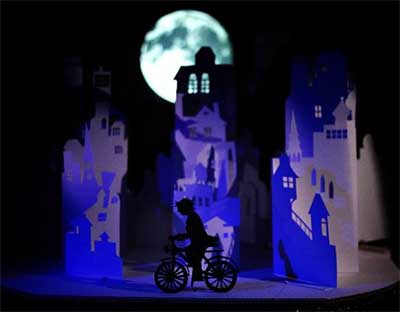 Si d’emblée la scénographie (Hugues Bernatchez) est concentrée en un seul endroit, elle n’est pas simple pour autant. Un miroir sans tain, qui permet une rétroprojection et un effet réfléchissant, est accroché à des rails au plafond, pouvant être amené ou retiré de l’aire de jeu. Sur cet écran « de fortune » sont projetés de magnifiques films d’animation dignes de courts métrages, sur lesquels on ajoute des jeux d’ombres chinoises. Un plateau, avec plusieurs assiettes rotatives, sert de petite scène ; tournent alors le pianiste sur son vélo, un train, une ville. Henri-Louis Chalem, de son côté, fait, dans cet espace exigu, de petites merveilles aux éclairages. Le tout donne un spectacle de marionnettes cinématographique d’une grande beauté et d’une poésie fantastique.